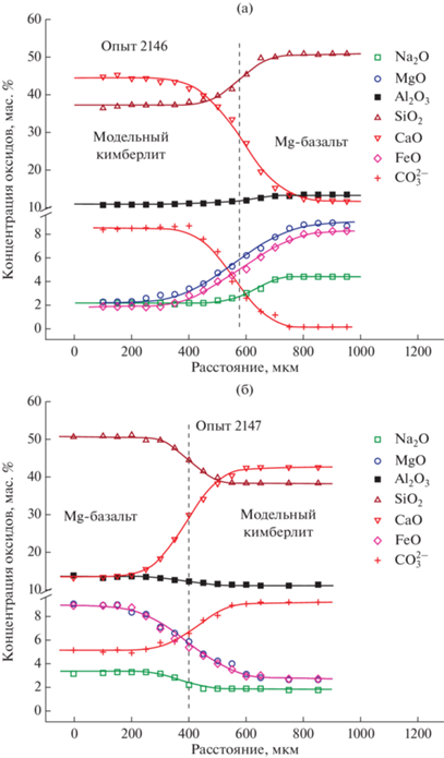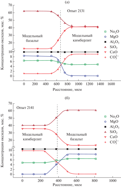 Распределение петрогенных компонентов вдоль диффузионных профилей было измерено на рентгеновском микроанализаторе. Представлены результаты измерений диффузионных профилей для пары модельные базальт–кимберлит (рис. 3, опыты 2131 и 2141) и для пары природный базальт–модельный кимберлит (рис. 4, опыты 2146 и 2147).