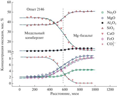 Экспериментальное исследование многокомпонентной химической диффузии петрогенных компонентов (SiO2, Al2O3, Na2O, CaО, MgO, FeO) и аниона ${\text{CO}}_{3}^{{2 - }}$ при взаимодействии базальтовых и кимберлитовых расплавов при умеренном давлении