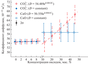 Концентрационная зависимость диффузионной подвижности компонентов установлена на основе численных расчетов по принятой методике (выражения (3), (4), (5)). Согласно полученным результатам, диффузионная подвижность всех компонентов в пределах ошибки определения (±20 отн. %) практически не зависит от их концентрации в расплавах диффузионных пар (рис. 5, 6). Так, например, на рис. 6 представлена концентрационная зависимость диффузии СаО и ${\text{СО}}_{3}^{{2 - }}$ при взаимодействии кимберлитового и базальтового расплавов с расчетной погрешностью 1 отн. %, которая существенно меньше реальной погрешности экспериментов (~20 отн. %). Тем не менее даже в этом случае два типа концентрационной зависимости (D(i) – constant и D(i) – экспонента) практически не различаются.