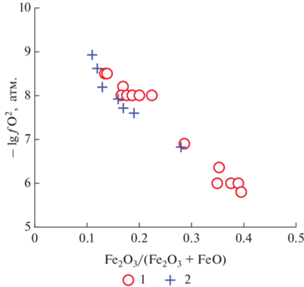Зависимость окисленности железа от значений –lgfO2 океанических базальтов. 1 – (Fudali, 1965), 2 – (Лебедева и др., 2001).
