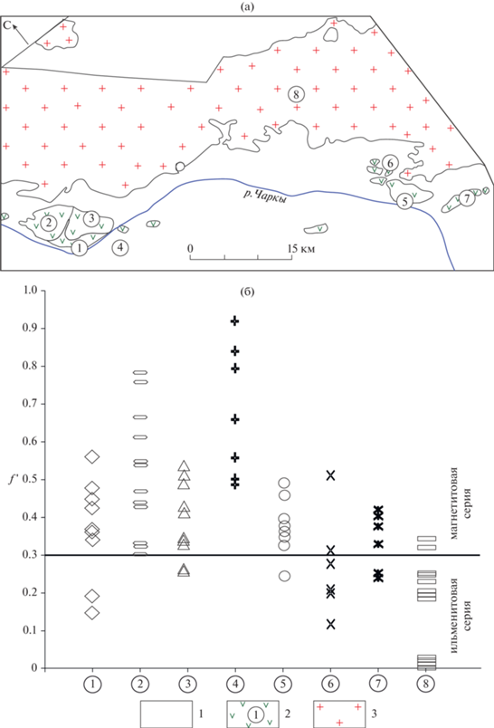 Чаркынский вулкано-плутонический пояс: (а) – схема расположения магматических образований по (Трунилина и др., 2003), (б) – коэффициент окисленности железа в магматических породах пояса. 1 – вмещающие юрские толщи, 2 – позднеюрский вулканический комплекс, 3 – раннемеловые гранитоиды. Цифры в кружках на рис. (а) соответствуют таковым на рис. (б): 1 – хангасская и безымянинская свиты, 2 – Северный Хангасский массив, 3 – Южно-Хангасский массив, 4 – Безымянный массив и высота 789.0, 5 – Наледный массив, 6 – Муочуньинский субвулкан, 7 – Оньохский субвулкан, 8 – Чибагалахский массив.