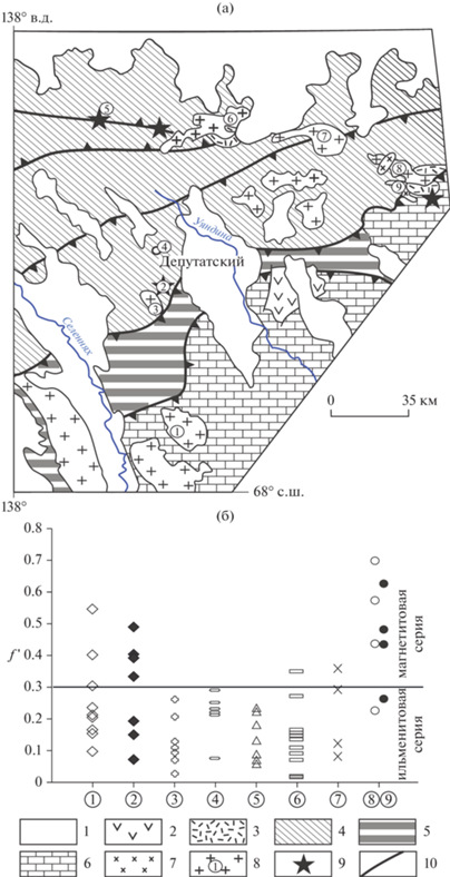 Западное выклинивание Северного батолитового пояса: (а) схема геологического строения (Трунилина и др., 2007), (б) коэффициент окисленности железа в гранитоидных массивах. 1 – кайнозойские отложения наложенных впадин; 2 – вулканиты K2 Джахтардахского поля; 3 – вулканиты K1b-br-K2s; 4 – юрские отложения Полоусненского синклинория; 5 – позднетриасовые терригенные образования; 6 – палеозойские терригенно-карбонатные породы; 7 – гранит- и риолит-порфиры; 8 – раннемеловые гранитоиды (цифры в кружках на рис. (б): 1 – Саханьинский, 2 – Кинели-Тасский, 3 – Коханахский, 4 – Депутатское рудное поле, 5 – Укачилканский, 6 – Бакынский, 7 – Куранахский, 8 – Североэликчагский, 9 – Верхнеэликчанский); 9 – магматические тела, показанные вне масштаба; 10 – основные разломы.