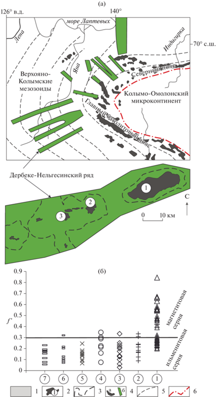 Дербеке-Нельгесинская зона: (а) по материалам (Трунилина, Роев, 2014) с упрощениями, (б) коэффициент окисленности железа в магматических породах зоны. 1 – юрские и триасовые вмещающие алевро-песчаниковые толщи; 2 – массивы гранитоидов (цифры в кружках на рис. (б): 1 – Безымянный, 2 – Хатакчанский, 3 – Бургочанский; 4–7 – дайки и мелкие массивы юго-западного фланга зоны: 4 – Кондеканский и его дайки, 5 – Бурдогарский, 6 – Сэкэтский, 7 – Дьялчанский); 3 – подземный контур массивов гранитоидов по геофизическим данным на глубине >500 м; 4 – пояса гранитоидов: а – продольные и б – поперечные; 5 – распространение основных складчатых структур; 6 – граница Колымо-Омолонского микроконтинента.