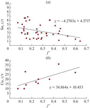 Как уже отмечалось во Введении, с окислительными условиями связано валентное состояние поливалентных элементов. Изменение валентности и, следовательно, изменение заряда и радиуса ионов приводит к кардинальному изменению геохимических особенностей данного элемента и определяет его растворимость в силикатных расплавах (Борисов и др., 1991). По экспериментальным исследованиям растворимость SnO в силикатных расплавах на три порядка выше растворимости SnO2 (Некрасов, 1984; Linnen et al., 1996). Эта закономерность подтверждается на материалах конкретных магматических поясов Юго-Востока России (Мишин, Романовский, 1992; Мишин и др., 2003, 2019, 2020; Меркулова, Мишин, 2015). Содержание олова в магматических породах направленно увеличивается с возрастанием восстановленности пород (рис. 13а). В противоположность олову содержание меди возрастает от восстановленных пород к окисленным (рис. 13б).