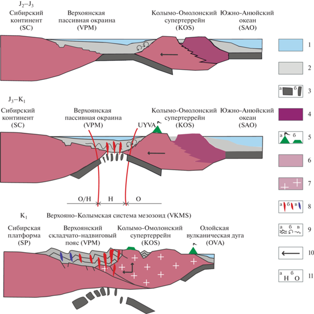 Возникновение ильменитовой (H), магнетитовой (O) и переходной (O/H) зон в литосфере Верхояно-Колымской складчатой системы на рубеже J2–K1, согласно схеме Ф.Ф. Третьякова (Третьяков, 2019) с добавлениями авторов. 1 – море; 2 – каменноугольно-мезозойские отложения; 3 – океаническая кора (а) и ее фрагменты (б); 4 – земная кора островодужных зон; 5 – вулканы (а) и вулканические образования (б); 6 – континентальная кора Сибирского континента; 7 – новообразованная континентальная кора Верхояно-Колымской системы мезозоид; 8 – гранитоиды коллизионные (а), локальные ильменитовые (б) и локальные магнетитовые (в) тела; 9 – складчатые структуры: сильнодеформированные (а), среднедеформирвоанные (б), слабодеформированные (в); 10 – направление движения Колымо-Омолонского блока; 11 – зоны восстановленного (а) и окисленного (б) фона. Буквенные обозначения: SC – Сибирский континент, VPM – Верхоянская пассивная окраина, КОS – Колымо-Омолонский супертеррейн, UYVA – Уяндино-Ясачненский вулкано-плутонический пояс, SAО – Южно-Анюйский океан, SP – Сибирская платформа, ОVA – Олойская вулканическая дуга, VKMS – Верхояно-Колымская система мезозоид.