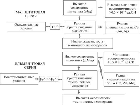 В восстановительных условиях железо находится преимущественно в подвижной двухвалентной форме и концентрируется главным образом в темноцветных минералах. И лишь избыток его после кристаллизации темноцветных минералов связывается в ильмените и магнетите, как правило, в виде единичных мелких зерен. Именно такой процесс обуславливает низкую, часто почти нулевую магнитную восприимчивость магматических пород ильменитовой серии. Наряду с железом и другие поливалентные элементы (Sn, Cu, Eu и др.) могут выступать в качестве индикаторов окислительно-востановительных условий кристаллизации магматических пород (Борисов и др., 1991; Мишин, 2010).
