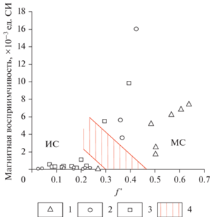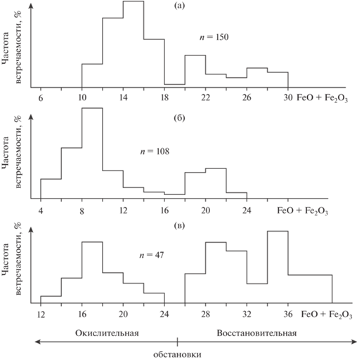 В распределении окисленности железа имеет место четкий минимум, поэтому к ильменитовой серии отнесены магматические породы со значениями f ' < 0.3, к магнетитовой – f ' > 0.3. Этому минимуму окисленности железа соответствует значение магнитной восприимчивости (0.5–0.6) × 10–3 ед. СИ (рис. 4, 5; Мишин и др., 2020; Hart et al., 2004).