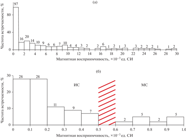 Гистограммы распределения магнитной восприимчивости в магматических породах Сихотэ-Алиньского орогенного пояса (Мишин и др., 2020). Полная выборка (а) и интервал 0–1 (б). Красная зона – граница между ильменитовой и магнетитовой сериями.