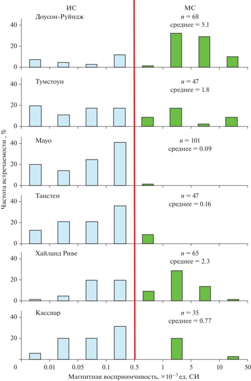 Преимущественно магнетитовый состав акцессорного рудного минерала и его высокое содержание создают повышенную магнитную восприимчивость пород (MS), позволяющую с помощью каппаметра уже непосредственно в поле картировать принадлежность магматических образований к той или иной серии пород (рис. 4). Это особенно актуально в тех случаях, когда граница между окислительным и восстановительным флюидными фронтами пересекает однородные в возрастном и петрографическом отношении изолированные тела гранитов. Типичные примеры: Аксакинский, Южный Сидимийский и Приисковый гранитоидные массивы в Сихотэ-Алине (Мишин и др., 2020), граниты в зоне перехода между ильменитовой и магнетитовой сериями в Калифорнии (Gastil, 1990), гранитоиды в Лахланском складчатом поясе Юго-Восточной Австралии (Sаto, 2012), на Аляске (Hart et al., 2004; рис. 5).