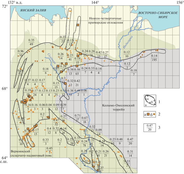 Карта фактического материала Восточной Якутии. 1 – зона распространения восстановительных (установленная (а), предполагаемая (б)) и окислительных (в) условий формирования магматических пород; 2 – месторождения Sn (а), рудопроявления Sn (б); 3 – средние значения коэффициента окисленности железа (f') в магматических породах для планшетов масштаба 1 : 200 000; в числителе – среднее значение коэффициента окисленности железа, в знаменателе – количество проб.