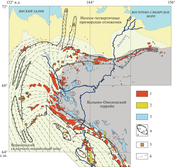 Карта окислительно-восстановительных условий формирования мезозойских магматических пород Восточной Якутии. Геологическая основа (Третьяков, 2019) с добавлениями авторов. 1 – интрузивные; 2 – субвулканические; 3 – вулканические породы (цифры в кружках – вулканические поля УЯВПП: 1 – Салтага-Тасское, 2 – Сыачанское, 3 – Кыра-Суордахское, 4 – Догдинское, 5 – Умбинское, 6 – Интахское); 4 – зона распространения восстановительных (установленная (а), предполагаемая (б)) и окислительных (в) условий формирования магматических пород; 5 – месторождения Sn; 6 – условная схема трещиноватости, радиальных и дуговых разломов по материалам (Третьяков, 2019; Трунилина и др., 1985).