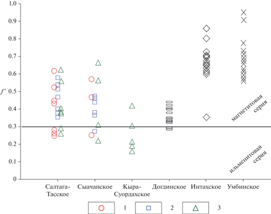Таким образом, граница между магнетитовой и ильменитовой сериями хорошо фиксируется и по магнитной восприимчивости, и по окисленности железа в породах. Фиксируемый интервал неопределенности (0.3–0.5) объясняется наличием постепенного перехода между окисленными и восстановленными породами. При построении карты окислительных условий формирования мезозойских магматических образований Восточной Якутии для разграничения магнетитовой и ильменитовой серии использовано предельное значение коэффициента окисленности железа (f ' = 0.3), что хорошо контролируется распределением оловоносности в регионе.