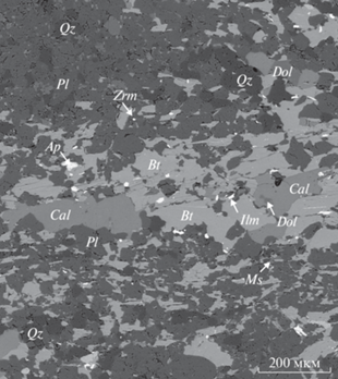 В качестве объекта исследования был использован образец карбонатсодержащей породы MAS-18 из зеленокаменного пояса Гияни (Сазерлэнд) кратона Каапвааль, ЮАР (McCourt, van Reenen, 1992; Перчук и др., 1996; Perchuk et al., 2000; van Reenen et al., 2011, 2019). Эта мелко-среднезернистая порода состоит из плагиоклаза (45%), биотита (20%) и кварца (20%), содержит 2% мусковита, а также акцессорные апатит, ильменит, циркон и монацит (рис. 1, табл. 1). Содержание карбонатов в породе составляет 7–10 об. % (рис. 1). Наряду с кальцитом (XCa > 0.9) в породе присутствуют карбонат доломит-анкеритового ряда (XCa = 0.5, XMg = = 0.35, XFe = 0.15), который образует как вростки в кальците, так и отдельные зерна (рис. 1). Гнейсовидная полосчатая текстура породы выражена в чередовании лейкократовых (кварц + плагиоклаз) и меланократовых (биотит + мусковит) прослоев (рис. 1). Карбонаты присутствуют как в меланократовых, так и в лейкократовых прослоях, но в меланократовых их содержание больше (рис. 1). Следуя особенностям минерального состава и текстуры, порода образца MAS-18 может быть охарактеризована как карбонат-биотитовый гнейс. Изотопный состав углерода и кислорода карбоната из обр. MAS-18 (δ13С = −2.2 ‰, δ18O = 17.5‰) указывает на его осадочное происхождение (Митяев и др., 2020). Валовый химический состав породы близок к грауваккам (табл. 1). Однако по сравнению с ними порода несколько обеднена SiO2, но обогащена CaO и CO2 (табл. 1) вследствие присутствия кальцита и карбоната доломит-анкеритового ряда.