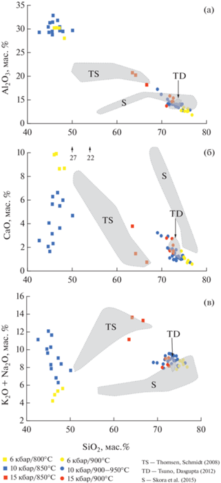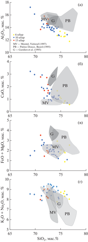 Экспериментальные данные по плавлению различных по составу метаморфических пород (см. обзоры в работах Moyen, Stevens, 2006; Weinberg, Hasalova, 2015; White et al., 2017; Gao et al., 2016) в интервалах давлений и температур, соответствующих средней и нижней континентальной коре, объясняют процессы образования различных типов гранитоидов. Однако экспериментальные данные по плавлению метаморфических субстратов, содержащих карбонаты, в этих условиях отсутствуют. Эксперименты с карбонатсодержащими субстратами проводились при давлениях более 20 кбар, моделируя их преобразования в ходе субдукции (Grassi, Schmidt, 2011; Thomsen, Schmidt, 2008; Tsuno, Dasgupta, 2011, 2012; Hammouda, Keshav, 2015; Mann, Schmidt, 2015; Skora et al., 2015). Они подтверждают возможность генерации разнообразных гранитоидных расплавов, сосуществующих с флюидом CO2 при повышенных давлениях, и раскрывают влияние карбонатной составляющей на температуру плавления различных субстратов и на составы образующихся расплавов.