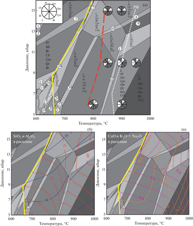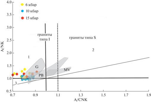 Все эти особенности плавления карбонатсодержащих метапелитов при повышенных давлениях могут быть экстраполированы на давления до 15 кбар. Однако процессы плавления пород с участием карбонатов в условиях континентальной коры должны заметно отличаться от таковых при более высоких давлениях из-за меньшей растворимости CO2 в водосодержащих гранитоидных расплавах (Papale et al., 2006; Ni, Keppler, 2013; Duncan, Dasgupta, 2015) и более ограниченной стабильности карбонатных минералов в присутствии кислых силикатных расплавов. Пониженная активность воды в водно-углекислых флюидах оказывает сильное влияние на плавление метапелитов при относительно низких давлениях (Clemens, 1993; Clemens et al., 1997). Термодинамическое моделирование равновесий в карбонатсодержащих метапелитах (Groppo et al., 2020) показывает, что присутствие кальцита существенно меняет фазовые соотношения в метапелитах, снижая роль слюд (прежде всего, мусковита) и повышая роль полевых шпатов. Продуктивность таких субстратов в отношении расплава понижается, сближая по этой характеристике карбонатсодержащие метапелиты с метаграувакками (Groppo et al., 2021).