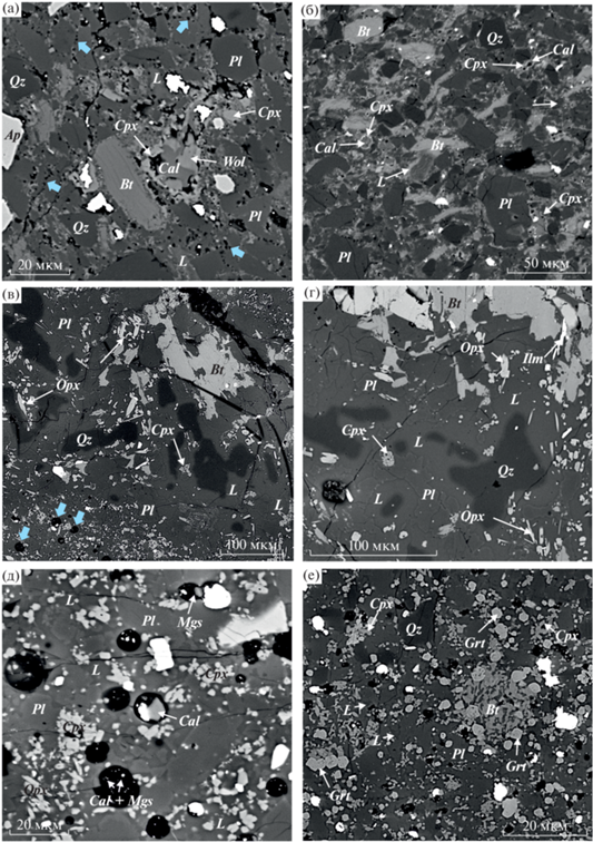 Фазовые ассоциации в продуктах опытов. (а) Тонкие каймы силикатных фаз (клинопироксен и волластонит) вокруг реликтовых зерен карбоната в продуктах опыта при 6 кбар и 800°С; листочки биотита также окружены каймами, фазовый состав которых трудно определить; участки стекла на границах зерен трассируются мелкими цепочками пор от пузырей флюида (голубые стрелки). (б) Каймы клинопироксена вокруг реликтовых зерен карбоната и биотита в продуктах опыта при 10 кбар и 850°С; закаленный расплав (L) образует тонкие каймы вдоль границ зерен. (в) Ассоциация Cpx + Opx + Ilm + Pl, сосуществующая с расплавом (L) в продуктах опыта при 6 кбар и 900°С; в стекле присутствуют поры от пузырей флюида (голубые стрелки). (г) Ассоциация Cpx + Opx + Ilm + Pl в обширных зонах плавления в продуктах опыта при 10 кбар и 900°С. (д) Закалочные карбонатные фазы в порах от пузырей флюида в стекле из продуктов опыта при 10 кбар и 900°С. (е) Ассоциация Grt + Cpx + Pl в продуктах опыта при 15 кбар и 900°С; пленки закаленного расплава, развитые по границам зерен, часто ассоциируются с округлыми порами от пузырей флюида. Символы минералов по (Whitney, Evans, 2010).