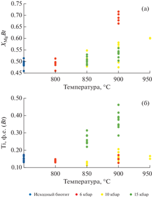 Состав биотита в продуктах опытов заметно отличается от состава исходного биотита (табл. 1). Его закономерные вариации указывают на переуравновешивание минерала в соответствии с Р-Т условиями экспериментов. При всех значениях давления магнезиальность биотита увеличивается с температурой (рис. 3а). Магнезиальность биотита в продуктах опытов при 15 кбар/850°C и 10 кбар/950°C близка и составляет 0.48–0.56 и 0.48–0.59 форм.ед. соответственно (рис. 5а). При 6 кбар и 900°C магнезиальность биотита максимальна (0.66–0.72, рис. 3а). Содержание Ti в биотите из продуктов опытов при 6 и 10 кбар сопоставимо с содержанием Ti в исходном биотите (0.14–0.16 форм. ед., табл. 1, табл. 3, рис. 3б). Содержание этого компонента в биотите в продуктах опытов при 15 кбар заметно выше и достигает 0.40–0.45 форм. ед. при 900°С (рис. 3б). Хотя исходный биотит не содержит фтор (табл. 1), в биотите в продуктах некоторых опытов фтор присутствует (табл. 3). Биотит из продуктов опытов при 10 кбар/900°C и 15 кбар/950°C содержит 0.5–1.2 мас. % F, а максимальное содержание фтора (до 2 мас. %) отмечено в биотите в продуктах опыта при 900°C и 6 кбар, что коррелируется с его максимальной магнезиальностью (табл. 3, рис. 3а).