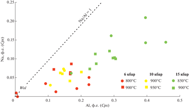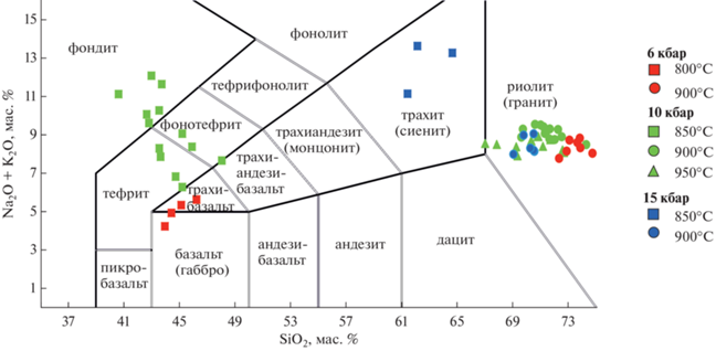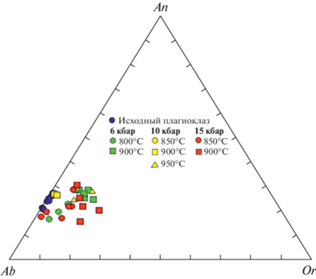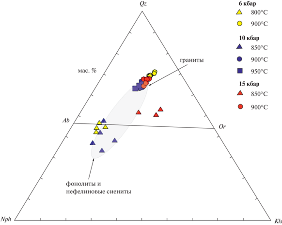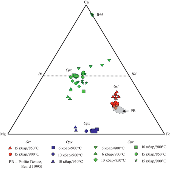 В продуктах экспериментов при 15 кбар (850 и 900°С) появляется гранат, ортопироксен отсутствует, а ильменит замещается рутилом (табл. 2). В них не обнаружены карбонатные фазы (рис. 2е). Агрегаты кристаллов клинопироксена и граната расположены в контактах зерен плагиоклаза и биотита (рис. 2е). Гранат также образует отдельные идиоморфные кристаллы размером 5–20 мкм, центральные зоны которых содержат мелкие включения (рис. 2е). Количество биотита заметно уменьшается с увеличением температуры за счет увеличения количества граната и клинопироксена, а также расплава. Однако в продуктах опыта при 15 кбар/850°С обнаружены лишь отдельные пленки стекла, а содержание стекла в продуктах опыта при 15 кбар/900°C не превосходит 2–3 об. % (рис. 2е). Пленки стекла сопровождаются порами, указывающими на сосуществование расплава и флюида (рис. 2е).