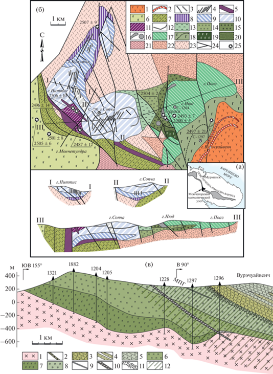 Схема геологического строения Мончегорского интрузива и зоны его сочленения с массивом Мончетундра, по (Смолькин и др., 2004). (а) Положение интрузивов в Печенга-Имандра-Варзугском поясе. (б) Строение Мончегорского интрузива и схематический геологический разрез через гору Вурэчуайвенч: 1, 2 – метавулканиты (1), кварциты и сланцы (2) кукшинской и сейдореченской свит Имандра-Варзугской зоны; 3 – дайки метадолеритов, лампрофиров; 4 – сульфидные жилы НКТ и массив Сопча; 5 – дайки габбро, меланоноритов, ортопироксенитов; 6 – габбро-нориты, анортозиты Мончетундровского плутона; 7 – бластокатаклазиты по габброидам; 8 – гарцбургиты и породы придонной зоны НКТ; 9 – переслаивание гарцбургитов, оливиновых ортопироксенитов и ортопироксенитов; 10 – ортопироксениты; 11 – дуниты, плагиодуниты и хромититы дунитового блока; 12 – горизонт “330” горы Сопча; 13 – плагиопироксениты; 14 – меланонориты; 15 – оливиновые нориты, гарцбургиты; 16 – породы "критического горизонта” горы Нюд; 17 – нориты; 18 – метагаббро-нориты, габбро и анортозиты предгорья горы Вурэчуайвенч; 19 – амфиболизированное габбро; 20 – диориты 10-й аномалии; 21–23 – вулканиты кислого состава горы Арваренч; 24 – разрывные нарушения; 25 – места отбора проб на изотопные исследования. 791, 1204, 1297 – скважины; I, II, III – геологические разрезы. (в) Схематический геологический разрез через массивы Нюд и Вурэчуайвенч: 1 – диориты архейского комплекса, 2 – базальные конгломераты и 3 – метабазальты кукшинской свиты, 4 – туфогенно-осадочные породы и 5 – метаандезибазальты сейдореченской свиты, 6 – меланориты, 7 – нориты с прослоями габбро-норитов, 8 – габбро-нориты с прослоями анортозитов, 9 – платиноносный горизонт с линзами и шлирами анортозитов, 10 – дайка меланократового микрогаббро, 11 – кора выветривания по габброидам, 12 – зона метаморфических преобразований габброидов.