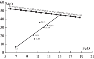 Используемый метод оценки состава оливина, предложенный в работе (Николаев, Арискин, 2005), позволяет рассматривать произвольные продукты смешения двух крайних компонентов вдоль линии, соединяющей их составы на вариационных диаграммах. Одним из компонентов является исходный расплав (состав которого заранее не известен), а другим – оливин, в отношении состава которого можно сделать реалистичный прогноз. Этот минерал более чем на 99 мол. % состоит из MgO, FeO и SiO2, поэтому на графических построениях составы оливинов формируют линию, отвечающую переходу от крайнего магнезиального члена (Fo) к железистому (Fa). Очевидно, что тренд продуктов смешения и линия эволюции составов оливина должны пересекаться в точке, которая отвечает исходному составу оливина, как одного из краевых компонентов. Пересечение, полученное с использованием шести образцов из нижней краевой зоны (рис. 10), указывает на вероятный состав оливина порядка 85–86 мол. % Fo.