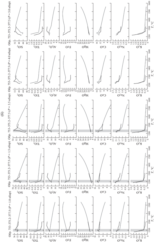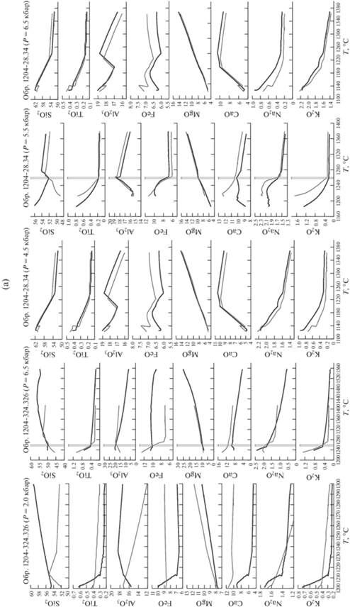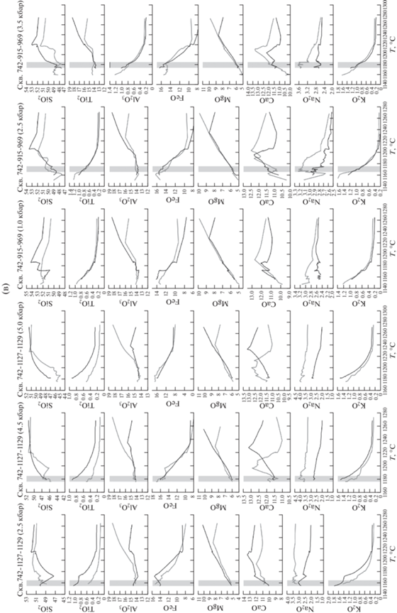 (а) Данные геохимической термометрии (обр. 1204-324.326): Р = 2.0–6.5 кбар, Т = 1260°С. Моделирование (обр. 1204-28.34): Р = 4.5 –6.5 кбар, Т = 1260°С. (б) Данные геохимической термометрии (обр. 753-375.2–377.5). Р ≈ 1.5–3.5 кбар и Т = 1200–1220°С (условия разделения кумулятивных фаз). (в) Данные геохимической термометрии (обр. 742-1127–1129; 742-915–969). Значение Р ≈ 3.5–4.5 кбар и Т = 1160–1180°С (условия разделения кумулятивных фаз).
