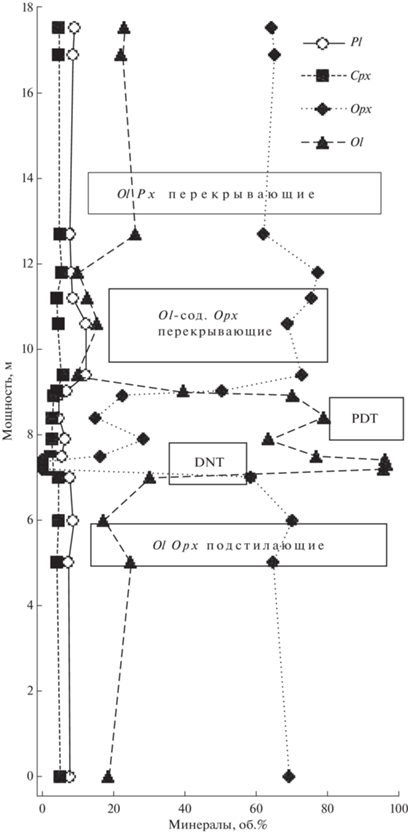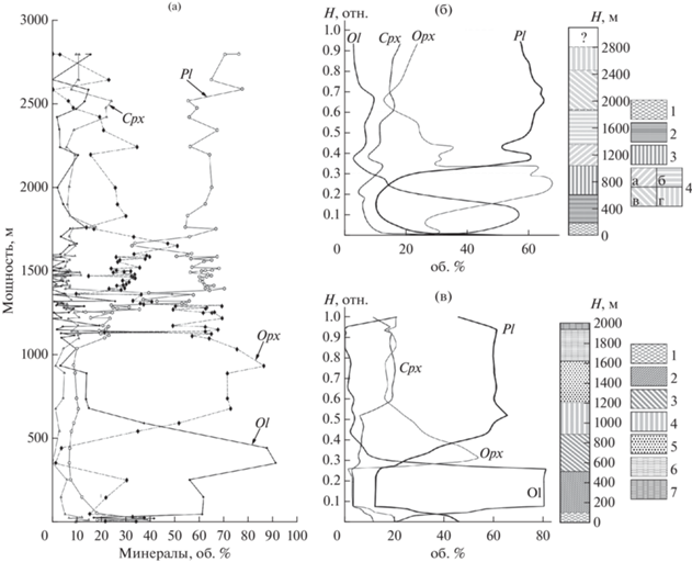 Субширотная ветвь Мончегорского интрузива использовалась авторами для реконструкции его вертикального строения, так как здесь представлен наиболее полный разрез пород расслоенной серии (рис. 2, табл. 1) Данные базируются на петрохимии, предоставленной Центральной Кольской экспедицией (скв. 791 – гора Сопча, скв. 1204 – гора Нюд, скв. 1297 – гора Вурэчуайвенч). Петрохимические типы пород в колонке вдоль вертикального разреза Мончегорского интрузива интерпретированы как кумулаты (рис. 2а). Ранее в работе (Семенов и др., 1995) при сопоставлении петрохимических и структурно-петрографических видов пород было показано, что, если нормативное содержание пироксена (Opx или Cpx) в породе с кумулятивной структурой превышает 10 об. %, а плагиоклаза 20 об. %, то эти минералы имеют, как правило, кумулятивную природу, если меньше, то интеркумулятивную. Для того чтобы отчетливее проявить закономерности распределения кумулятивных минералов была проведена серия сглаживаний первичных распределений методом скользящего окна. Оптимальными оказались результаты десятикратного трехточечного сглаживания (рис. 2б). В разрезе интрузива выделяются: