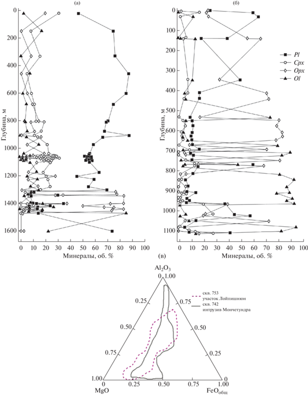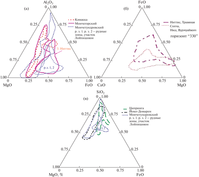 На треугольной диаграмме Al2O3–FeO–MgO (рис. 9а) по положению точек составов, соответствующих дифференциатам пород массива Мончетундра, видно, что часть их (скв. 753), представленная породами краевой зоны, попадает в поле дифференциатов Мончегорск–Кивакка, а другая часть в поле дифференциатов интрузива Ципринга и Йоко-Довырен (диаграмма SiO2–FeO–MgO, рис. 9в). Рисунок 9в демонстрирует, что при всей однотипности полей химических анализов пород массива Мончетундра отсутствует ярко выраженная в интрузивах Йоко-Довырен и Ципринга “железистая ветвь”. В массиве Мончетундра большую долю в разрезе занимают лейкократовые породы (лейкократовые габбро и анортозиты). Рисунок 9а демонстрирует, что область пород субмеридиональной ветви Ниттис–Кумужья–Травяная совмещается с областью пород рудных зон, относимых к массиву Мончетундра (Пентландитовое ущелье), и не совпадает с областями пород интрузии Кивакка и Мончегорского интрузива (вертикальный разрез построен с использованием данных по скв. 1297, 1204, 791 – широтной ветви). На диаграмме FeO–MgO–CaO (рис. 9б) породы рудной зоны формируют отдельное поле.