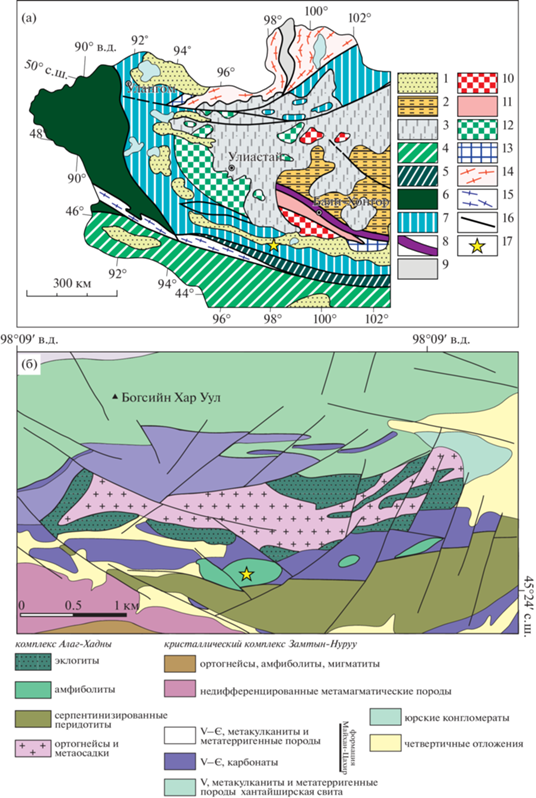 (а) Геологическая структура центрального сегмента Центрально-Азиатского складчатого пояса, по (Козаков и др., 2021). 1 – четвертичные отложения; 2 – турбидитные отложения девона–карбона; 3 – нерасчлененные вулкано-плутонические комплексы палеозоя–раннего мезозоя; 4 – палеоокеанические и островодужные герциниды Южно-Алтайской зоны; 5 – отложения континентального склона и пассивной окраины; 6 – поздние каледониды Монголо-Алтайской зоны; 7 – палеоокеанические и островодужные комплексы эдиакария–нижнего кембрия Озерной зоны; 8 – эдиакарий–неопротерозойские офиолиты Баянхонгорской зоны; 9 – ранненеопротерозойские палеоокеанические и островодужные комплексы; 10–15 – установленные и предполагаемые блоки кристаллических пород: 10 – раннего докембрия, 11 – нерасчлененные шельфовые и вулканические толщи Баянхонгорской зоны и метаморфические породы Южно-Хангайского метаморфического пояса (поздний неопротерозой), 12 – метаморфические комплексы раннего неопротерозоя (обнаженные и предполагаемые под чехлом), 13 – метаморфические комплексы позднего неопротерозоя, 14 – метаморфические комплексы раннего палеозоя, 15 – метаморфические комплексы позднего палеозоя; 16 – тектонические границы, разломы; 17 – положение объекта исследований. (б) Схема геологического строения района исследований, по (Buriánek et al., 2017) с изменениями авторов.