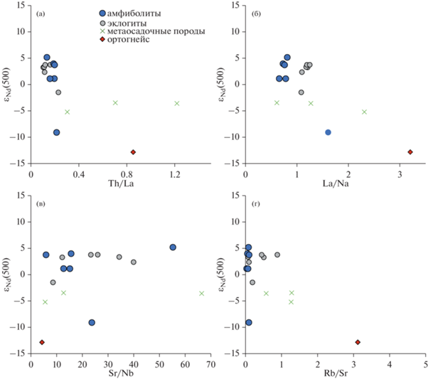 Контаминация базитовых, подобных MORB, расплавов коровым субстратом должна сопровождаться проявлением минимумов по высокозарядным элементам (прежде всего, Nb-Ta и Ti) относительно РЗЭ и соответствующим увеличением значений отношений, в частности Th/La, La/Nb, Sr/Nb, что в общем случае не характерно для изученных пород (рис. 10а–10в). Подтверждением этому выступает отсутствие корреляции между изотопным составом Nd и вышеобозначенными отношениями в исследованных породах и, напротив, типично радиогенный состав Nd в амфиболитах, наиболее обогащенных легкими РЗЭ (например, в обр. М16-44). Кроме того, низкая щелочность и титанистость амфиболитов также не типична для континентальных толеитов. Таким образом, систематически повышенное содержание крупноионных литофильных элементов, Th и U может быть отчасти обусловлено процессами генерации исходных расплавов. Вместе с тем среди эклогитов и амфиболитов присутствуют образцы с отношением Th/Nb выше, чем в MORB (Pearce et al., 2021), а также единичные образцы с минимумами Nb–Ta и нерадиогенным изотопным составом Nd (εNd(Т) < 0). Такие особенности могут быть объяснены контаминацией исходных расплавов континентальной корой. Кроме того, обогащение амфиболитов и эклогитов всех выделенных геохимических типов по Th, U и (в разной степени) Nb и Ta, по сравнению с базитами типа MORB, свидетельствует о потенциальном участии в процессе плавления вещества литосферной мантии.