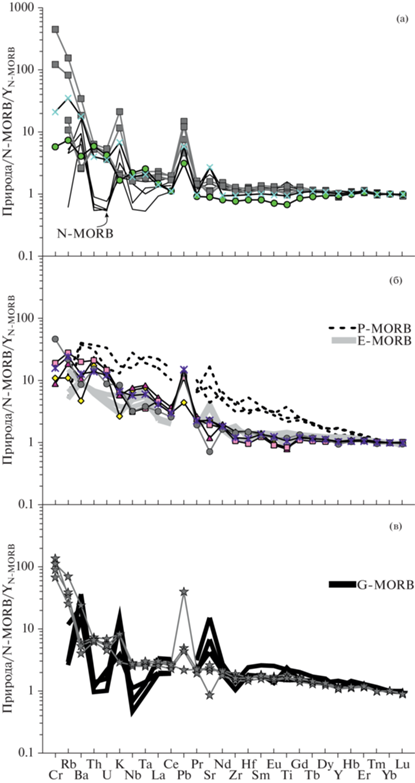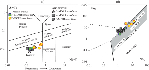Дискриминационные диаграммы, основанные на содержании немобильных при метаморфических преобразованиях компонентов (Pearce, 2014; Saccani, 2015), позволяют классифицировать все образцы амфиболитов как толеитовые базальты (рис. 11а). На диаграмме ThN–NbN (рис. 11б) точки составов амфиболитов лежат в области океанических базальтов, причем деплетированные легкими РЗЭ амфиболиты – в поле N-MORB, а обогащенные – в перекрывающихся полях E-MORB и P-MORB. Дополнительное нормирование содержаний редких элементов к YbN-MORB позволяет минимизировать эффект фракционирования (Pearce et al., 2021) и указывает на близость деплетированных легкими РЗЭ амфиболитов к N-MORB по всем характеристикам за исключением обогащения Th и U (рис. 12а). Обогащение амфиболитов консервативными Th, Nb и Ta должно отражать состав источника плавления при образовании их протолитов. Таким образом, протолиты деплетированных амфиболитов не могли образоваться только при участии деплетированного мантийного источника. Нормированные к N-MORB и YbN-MORB составы обогащенных легкими РЗЭ амфиболитов комплекса Алаг-Хадны (обр. M16-37, M16-43, M16-44) подобны E-MORB, в частности составу толеитовых базальтов офиолитового комплекса Сарв-Абад (Иран) (Saccani et al., 2014), за исключением более высоких содержаний тех же Th и U (рис. 12б). В этих породах не отмечается какого-либо прогрессивного вклада типично корового, обогащенного компонента. Вместе с тем, согласно использованным моделям дискриминации, эклогиты комплекса Алаг-Хадны наиболее соответствуют базитам типов N-MORB и G-MORB (рис. 11–13).