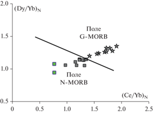Дискриминационная диаграмма разделения вулканических пород N- и G-MORB в координатах Dy/Yb–Ce/Yb, по (Saccani и др., 2015). Значения нормированы на хондрит C1 (Sun, McDonough, 1989). Условные обозначения см/ на рис. 11.