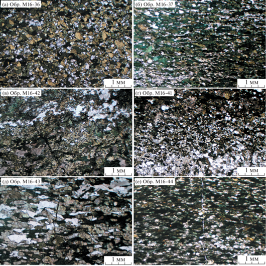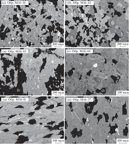 Амфиболиты образуют протяженные округлые тела (от первых метров до 2 км по удлинению) в карбонатах формации Майхан-Цахир между зоной высокобарических пород и метаперидотитами и являются тектоническими мегабудинами. Стоит отметить, что непосредственного совмещения эклогитов и амфиболитов ни в карбонатах к югу от зоны высокобарических пород, ни в пределах самой зоны не наблюдается: максимально ретроградно преобразованные эклогиты здесь представлены апоэклогитовыми гранатовыми амфиболитами. Сами породы сложены амфиболом (40–70%), клиноцоизитом (20–30%), плагиоклазом (20–30%), в ряде случаев кварцем (до 10%) и акцессорными титанитом/рутилом/титаномагнетитом, имеют серо-черный цвет, полосчатую текстуру, от мелко- до среднезернистой структуру с присутствием частых прожилков серицит-кальцит-хлоритового состава. Петрографическое исследование выявило широкий спектр характерных структур и текстур (рис. 2, 3): от массивных и мелкозернистых (зерна до 100 мкм) гранонематобластовых без каких-либо признаков директивности (рис. 2а, 2г; 3а, 3е) до заметно ориентированных, нематобластовых и полосчатых, связанных, прежде всего, с ориентировкой амфибола и эпидота-клиноцоизита (рис. 2б, 2д, 2е; 3в, 3д). В ряде амфиболитов полосчатость сопровождается существенным увеличением крупности зерен (до 1–1.5 мм, рис. 2д, 3д) как породообразующих амфибола и эпидота-клиноцоизита, так и акцессорного титанита. Признаков мигматизации в породах не наблюдается. Аббревиатура минералов приведена в соответствии с (Whitney, Evans, 2010).