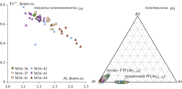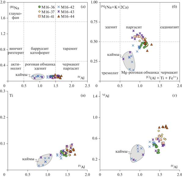 Амфибол относится к Ca-группе и по составу варьирует от паргасита до магнезиальной роговой обманки ([B]Na = 0.07–0.16, IVAl = 0.79–1.69) (рис. 4а; приведено согласно Tsujimori et al., 2006). Согласно классификации амфиболов по (Hawthorne et al., 2012), фигуративные точки составов лежат преимущественно в поле магнезиальной роговой обманки при [A](Na + K + 2Ca) = 0.14–0.64, [C](Al + + Ti + Fe3+) = 0.58–1.29 (рис. 4б). Схожая картина наблюдается при пересчете составов на формульные коэффициенты по (Holland, Blundy, 1994). Содержание Ti (0.02–0.10 форм. ед.) меняется незначительно при более существенных вариациях IVAl (см. выше) и VIAl (0.19–0.85 форм. ед.). Рассчитанная железистость (Fe2+/(Fe2+ + Mg)) амфиболов находится в пределах 0.18–0.46 при Fe3+/(Fe3+ + Al) = 0.18–0.77. Наблюдаемые тренды и особенности состава типичны для метаморфических амфиболов в метабазитах средних ступеней (Геря и др., 1997; Zenk, Schulz, 2004; Schumacher, 2007) и указывают на отсутствие реликтов первично-магматического амфибола. В пределах отдельных образцов амфибол не зонален или слабо зонален, центральные зоны представлены более высокотитанистым и высокоглиноземистым амфиболом. В образцах М16-42 и М16-43 подобная зональность наиболее очевидна ввиду заметного обеднения Al, Na и/или Ti в краевых зонах (рис. 4). Подобная закономерность, как и общий характер и масштаб вариации состава амфибола, в данных образцах предполагает переуравновешивание первичных амфибол-эпидот-плагиоклазовых парагенезисов на уровне низкотемпературной эпидот-амфиболитовой фации.