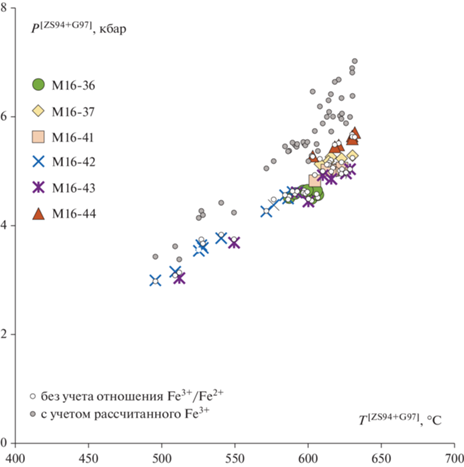Несмотря на крайне ограниченные вариации минерального состава метабазитов средних ступеней (Oh, Liou, 1998), куда более вариативным может быть состав зональных породообразующих фаз, в частности Ca-амфибола (Laird, Albee, 1981; Raase, 1994; Zenk, Schulz, 2004), который является важным источником информации о P-T эволюции пород. Состав амфиболов, в частности степень чермакитового и глаукофанового изоморфизма, зависит от степени метаморфизма, что приводит к увеличению содержаний Ti, VIAl, [A]Na с ростом температуры и VIAl и [M4]Na с ростом давления (Brown, 1977; Spear, 1980; Геря и др., 1997; Ernst, Liu, 1998; Zenk, Schulz, 2004). В настоящей работе оценки P-T параметров получены по амфибол-плагиоклазовому геотермометру (Holland, Blundy, 1994). Применимость последнего, однако, ограничена ввиду (1) присутствия свободного кварца, участвующего в амфиболобразующих реакциях, только в двух образцах, (2) повсеместного замещения первичного плагиоклаза (присутствие двух генераций плагиоклаза или полное отсутствие андезин-олигоклаза) и (3) потенциально неравновесного характера ассоциации позднего амфибола с альбитом. Следствием этого могут являться несколько завышенные значения температуры (в расчете на давление 7 кбар), полученные по всем бескварцевым амфиболитам (~690–750°С для обр. М16-36, 650–730°С для обр. М16-37, 680–710°С для обр. М16-41), чуть более низкие значения 640–690°С для обр. М16-42 с единичными зернами кварца. Наблюдается отсутствие нормальных оценок для кварцсодержащих амфиболитов (обр. М16-43, М16-44), где плагиоклаз представлен исключительно альбитом. Серия P-T оценок, полученных по составу амфибола с использованием геотермобарометров, согласно (Геря и др., 1997), в модифицированном виде по (Zenk, Schulz, 2004), сосредоточены в относительно узком диапазоне более умеренных температур (570–630°С) и давлений (4–7 кбар), с более низкими параметрами, характерными для бедных Al и Ti кайм двух образцов М16-42 и М16-43 (500–550°С, 3–4 кбар) (рис. 6).