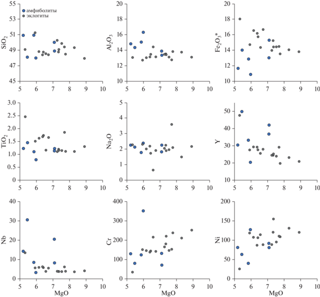Изученные амфиболиты характеризуются довольно ограниченным диапазоном содержания SiO2 = 48.0–51.0 мас. % и суммы щелочей (K2O + + Na2O) = 2.07–2.85 мас. %, низко-умеренным TiO2 = 0.49–1.45 мас. % и Mg# = 0.44–0.52, которые соответствуют низкотитанистым железистым толеитам (табл. 2). Магнезиальность пород (Mg# = 0.30–0.38) соответствует наименее магнезиальным эклогитам, при этом для амфиболитов с наименьшим содержанием магния (MgO менее 6 мас. %) характерны наибольшие отклонения от состава эклогитов (рис. 7), в частности повышенные содержания Al2O3 и CaO и, напротив, пониженные FeO и TiO2.