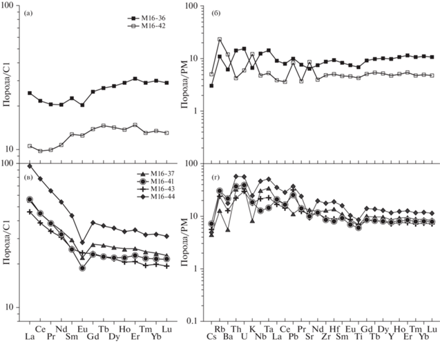 Амфиболиты имеют содержание TiO2 (на уровне типичных MORB, ~1.5 мас. %), а также близкие к N-MORB содержания SiO2 (в пределах 49–51 мас. %), Na2O (~2 мас. %) при систематически более высоком содержании FeO (>11 мас. %) (рис. 7). Магнезиальность пород ниже, чем в примитивных расплавах MORB (Mg# 47.3–52.3), следовательно, их составы не соответствуют первичным расплавам и могут быть результатом фракционирования расплавов в процессе кристаллизации оливина, плагиоклаза и Ti-магнетита. Следствием этого могут быть высокие содержания тяжелых РЗЭ и отрицательные аномалии Eu и Ti в породах. Относительно других пород протолит амфиболита, обр. M16-42, мог быть обогащен минералом c низкими содержаниями РЗЭ, например плагиоклазом. Это подтверждается высоким содержанием в породе Al2O3 и положительными аномалиями Rb и Sr, тогда как отсутствие положительной аномалии Eu может быть связано с интрузивной, а не эффузивной природой протолита амфиболита.
