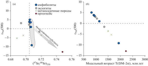 В то время как изотопно-геохимические особенности большинства амфиболитов и эклогитов комплекса Алаг-Хадны указывают на умеренно-деплетированный мантийный источник родоначальных для протолита расплавов, согласующийся с обстановкой растяжения и формированием океанической коры, в рамках этих процессов сложно объяснить существование пород с нерадиогенными Nd (εNd(Т) < 0) характеристиками как среди амфиболитов (рис. 9, 10, табл. 3), так и среди эклогитов (Skuzovatov et al., 2018). Соответствующие величины εNd(Т) могут быть проинтерпретированы как влияние корового субстрата через контаминацию или взаимодействие с коровым флюидом на стадии амфиболизации (рис. 9), однако изотопные характеристики не коррелируют с геохимическими признаками вклада корового компонента и в целом соответствует крайним составам обогащенных E-MORB, например таковых для Индийского океана (например, White, Klein, 2014).