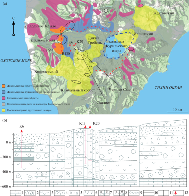 (а) Схематическая геологическая карта Южной Камчатки и местоположение рассматриваемых объектов. Красная пунктирная линия ограничивает Паужетскую кальдеру, синяя – кальдеру Курильского озера (границы приведены согласно Ponomareva et al., 2004; Bindeman et al., 2010). Красными точками обозначены скважины, черными ореолами – места отбора проб на Камбальном хребте. Границы геологических объектов приведены согласно (Рычагов и др., 2017; Белоусов, 1978), залегание голыгинских игнимбритов – (Bindeman et al., 2010), отложения извержения, приведшего к образованию кальдеры Курильского озера, согласно (Ponomareva et al., 2004). (б) Геологический разрез Паужетского геотермального месторождения по (Структура …, 1993). 1 – вулканомиктовые песчаники основания разреза, анавгайская серия; 2 – агломератовые туфы и туфобрекчии андезибазальтового состава, алнейская серия; 3 – голыгинский горизонт; 4 – нижнепаужетская подсвита; 5 – среднепаужетская подсвита; 6 – верхнепаужетская подсвита; 7 – андезиты и андезибазальты: а – крупные потоки лав и тела субинтрузивных микродиоритов, б – дайки; 8 – экструзии (а) и лавы (б) дацитов; 9 – лавобрекчии оснований потоков лав и краевых частей экструзивных тел; 10 – литологические и интрузивные границы; 11 – тектонические нарушения; 12 – поисковые и разведочные скважины, из керна которых проводился отбор образцов.