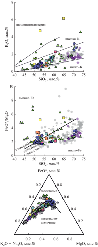 Породы доголыгинских региональных эруптивных центров (см. рис. 1), сформировавшиеся 3–2 млн лет назад, относятся к умеренно-калиевым и умеренно-железистым андезитам и андезибазальтам, тогда как метасоматизированные породы алнейской серии в подошве голыгинских игнимбритов (420–440 тыс. лет), вскрытые внутрикальдерными скважинами, представлены туфами и туфобрекчиями основного состава и редкими потоками базальтовых лав (см. Supplementary, ESM_1.xlsx (Таблица A.2 ); Структура …, 1993; рис. 2).