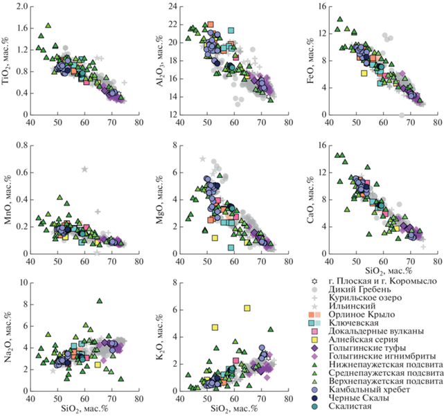 Диаграммы Харкера для пород Паужетского района. Оконтуренные черными значки – новые данные; неочерченные – согласно литературным источникам (составы пород извержения кальдеры Курильского озера, вулканов Ильинский, Плоская, Коромысло, Дикий Гребень, Ключевская и Орлиное Крыло – согласно работам: Bindeman, Bailey, 1994; Bindeman et al., 2004, 2010, 2019; Покровский и др., 1999; Толстых и др., 2003; Ponomareva et al., 2004). Здесь и далее на диаграммах содержания петрогенных элементов приведены в пересчете на 100% сухого вещества.