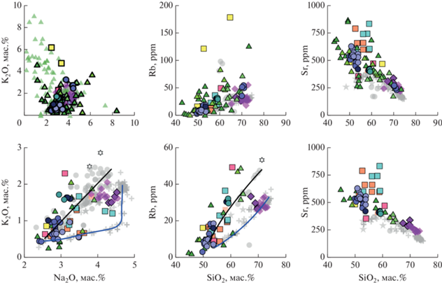 Полученные данные (верхний ряд диаграмм) и данные, использованные для дальнейшей интерпретации (без анализов сильно метасоматизированных образцов). Условные обозначения см. на рис. 2. Черная линия обозначает тренд эволюции пород влк. Дикий Гребень, синяя кривая – отложений Курильского озера (вслед за Ponomareva et al., 2004).