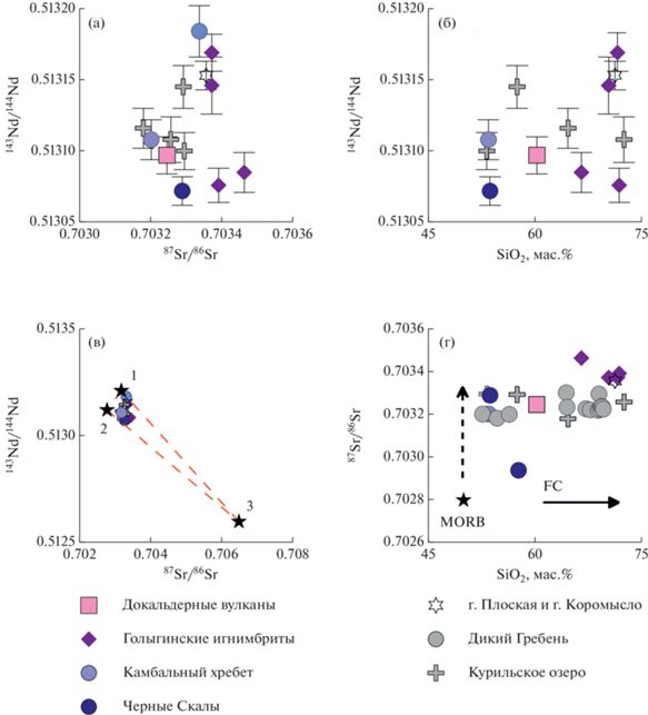 Отсутствие значительного изменения изотопных отношений в ходе эволюции состава магм (рис. 5) согласуется с геохимическими наблюдениями и подтверждает доминирующую роль фракционной кристаллизации в процессе формирования всего разнообразия рассматриваемых пород. Вариации изотопного состава Sr и Nd кальдерообразующих извержений отвечают увеличению влияния магм мантийного происхождения на состав системы в ходе подъема значительных масс наиболее эволюционировавших магм, а также захвату и частичной ассимиляции ранее сформировавшихся и зачастую гидротермально измененных пород, что согласуется с обеднением δ18O в голоценовых игнимбритах Курильского озера относительно более древних голыгинских игнимбритов (Bindeman et al., 2010).