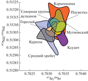 Фигуративные точки составов пород Паужетского района в координатах соотношений изотопного состава Sr и Nd ложатся в левую часть треугольника: средний состав измененных базальтов камчатских офиолитов–состав мантийного клина–средний состав осадков в северо-западной части Тихого океана, что в целом характерно для голоценовых камчатских вулканитов (например, Portnyagin et al., 2015) и позволяет предполагать мантийное происхождение родительских магм. Близкие к MORB значения отношения 143Nd/144Nd при систематическом сдвиге величины 87Sr/86Sr в более радиогенную область интерпретируется нами как результат влияния богатого стронцием и бедного неодимом флюида, отделяющегося от измененной океанической коры погружающегося слэба (Kepezhinskas et al., 1997; Dorendorf et al., 2000; Churikova et al., 2001; Portnyagin et al., 2007), на мантийный источник.