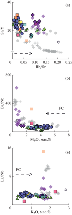 Вариации отношений микроэлементов в породах Паужетского района. Условные обозначения см. на рис. 2. Пунктирными стрелками обозначены тренды изменения состава при фракционной кристаллизации (FC).
