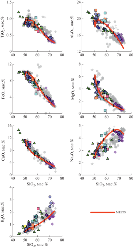 Для проверки возможности получения всего диапазона составов пород Паужетского района в ходе эволюции магм, выплавляющихся из единого источника с последующей дифференциацией, было проведено моделирование с помощью программы MELTS (Gualda et al., 2012). В качестве стартового состава рассматривались базальты влк. Ильинский из работы (Ponomareva et al., 2004) и базальты влк. Камбальный – наиболее основные из рассматриваемых пород, не подвергавшихся гидротермальной проработке. Вариации условий (9–1 кбар), режимов (фракционирование при постоянном давлении, декомпрессионная кристаллизация, смена режимов) и содержания воды (0.5–5 мас. %) позволили получить составы голыгинских игнимбритов из исходных базальтов. Наилучшее соответствие (рис. 8) обеспечивает фракционирование стартового базальта влк. Камбальный с содержанием воды 2 мас. % при 6 кбар и кислородном буфере NNO.