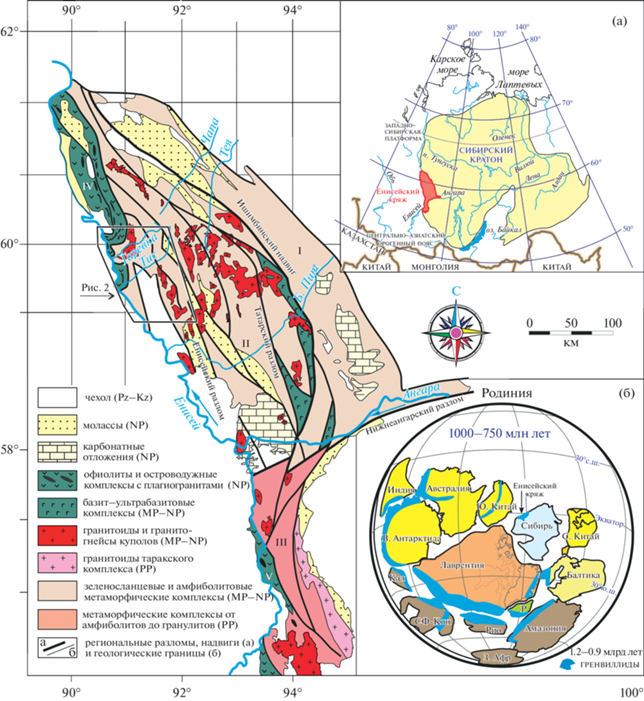 Местоположение района исследований на схематической тектонической карте Енисейского кряжа. Тектонические блоки: I – Восточный (приплатформенный) и II – Центральный Заангарского сегмента; III – Южно-Енисейский (Ангаро-Канский) сегмент, IV – Исаковский и V – Предивинский островодужные террейны. (a) – положение Енисейского кряжа в структуре Сибирского кратона; (б) – конфигурация ядра Родинии и расположение подвижных поясов гренвильской складчатости показаны голубым цветом по (Rino et al., 2008) c модификацией (Ernst et al., 2008) в период ее стабилизации. Положение Сибирского кратона по (Метелкин и др., 2012). Символы для малых кратонов: С – Свальбард, Кал – Калахари, СФ-Кон – Сан-Франциско-Конго, Рио – Рио де ла Плато, З. Афр – Западная Африка, Р – Рокол.