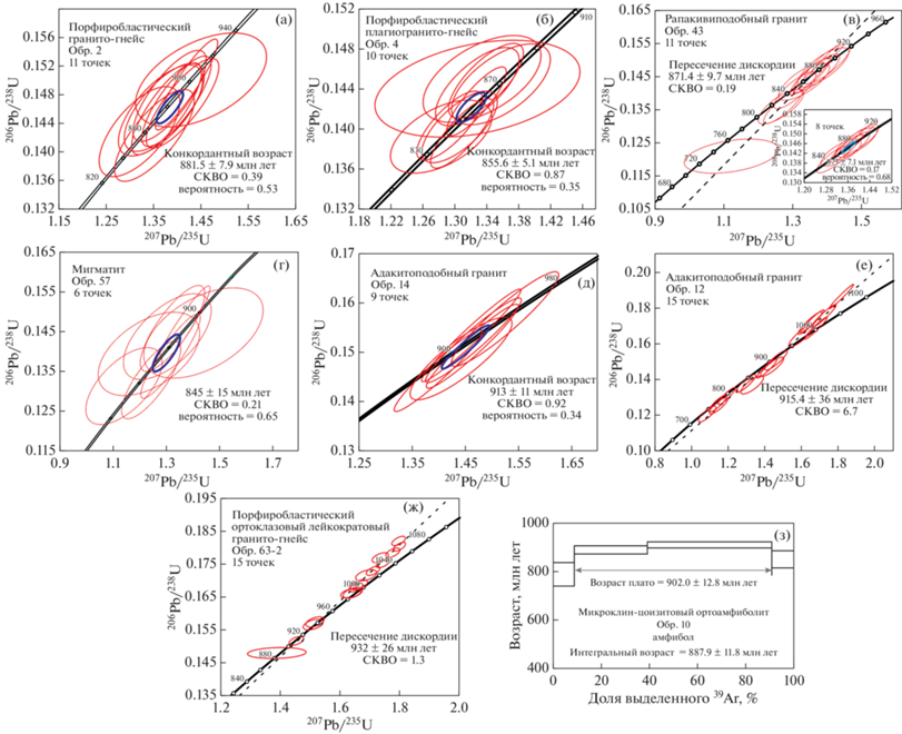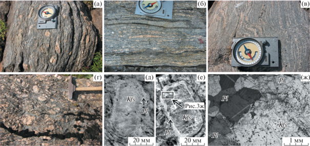 Среди мигматизированных гнейсов с порфиробластами микроклинизированного ортоклаза обнаружены мелкие будинированные массивы и маломощные тела метаморфизованных биотитовых гранитов рапакиви (Лиханов и др., 2012б). В них сохраняются первичный минеральный состав, мегакристаллы карлсбадских двойников ортоклаза, маргинационная структура, крупноовоидная и слабо проявленная плоскопараллельная текстуры исходных магматических пород (рис. 3г). Наличие в гранитоидах кайм олигоклаза шириной 2–3 мм, обрамляющих овоидные мегакристы ортоклаза (от 5 до 10 см) (рис. 3д–3ж), и ассоциация с микроклин-цоизитовыми ортоамфиболитами, метаморфизованными аналогами мафических пород (габбро и монцодиоритов), типичны для гранитов рапакиви (Лиханов, Ревердатто, 2014б; Dempster et al., 1994; Ramo, Haapala, 1995). Простирание будин этих пород согласуется с северо-западным направлением субвертикальных разломов, проникающего кливажа-сланцеватости и тонкой крутопадающей полосчатости бластомилонитов, согласных с общим простиранием ПРСЗ. Характерными признаками бластомилонитов, формирование которых связывается с тектоническими сбросо/взбросовыми и сдвиго/раздвиговыми деформациями в локальных сдвиговых зонах (Лиханов и др., 2021), являются линейная деформационная гнейсовидность, наличие упорядоченных структур катакластического и пластического течения, ассиметрия слюдяных порфирокласт и внутрислойных складок, растяжение складок течения с кулисообразной морфологией, полоски излома в слюдах, “тени давления” перекристаллизованного кварца, S-образные и сильно деформированные зерна граната со структурами “снежного кома”, разрывы минеральных зерен со смещением и формированием “лоскутных” полосок, параллельное распределение мелкозернистых линзообразных минеральных агрегатов, а также рассланцевание, катаклаз и будинаж мигматитов (Козлов и др., 2020).