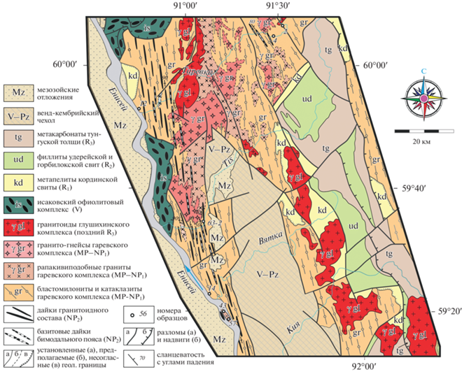 Детальный обзор геохронологии, тектонической позиции и геодинамической природы комплексов, участвующих в строении региона, приведены в работах (Лиханов и др., 2014, 2018, 2021). Там же представлена хронологическая последовательность крупных этапов и событий в геологической истории Енисейского кряжа, сформировавших его тектонический облик.