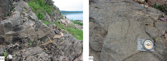 Обнажения пластов массивных биотитовых плагиогнейсов немтихинской толщи: линзообразная форма с межпластовым развитием поздних микроклиновых пегматитов и крупно-очковых микроклиновых гнейсов (а) и среднезернистых микроклиновых гнейсов со следами пластических деформаций (б). Правый берег р. Енисей в 1.2–1.5 км ниже устья р. Гаревки. Фото П.С. Козлова.