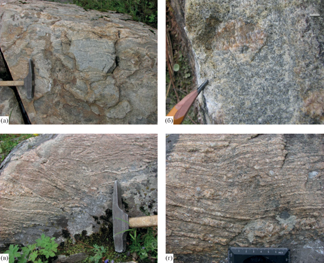 Ортоклазовые мигматизированные порфиробластические лейкогранитогнейсы образуют неоднородные по составу и структурно-текстурным особенностям тела субмеридианального простирания видимой мощностью не менее 150–200 м в мелкозернистых амфиболитах и кварцитах малогаревской толщи (рис. 5). Характерно неравномерное распределение порфиробластов голубовато-серого ортоклаза (размер от 1 до 2 см) – от единичных индивидов (рис. 5б) до 1% в полосчатых разностях (рис. 5в, 5г). Эти породы интенсивно бластомилонитизированы с образованием зон ортобластомилонитов северо-западного простирания мощностью от 20–30 см до 3–4 м. Участками в гранито-гнейсах хорошо проявлено рассланцевание, связанное с процессами поздней бластомилонитизации, сопровождаемой микрогрануляцией кварца, ориентированным биотитом в парагенезисе с плагиоклазом, мирмекитом на контактах его с ортоклазом и решетчатым микроклином.